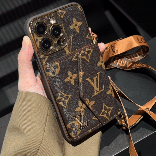 Stylish monogram iPhone case with bold big printing, card holder, and crossbody strap, offering luxury design, hands-free convenience, and strong protection.