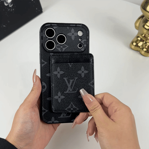This stylish leather monogram iPhone case features elegant black printing and a magnetic card holder for modern convenience. Designed for the iPhone 17 Series, it delivers reliable protection, refined texture, and a bold yet timeless luxury look.